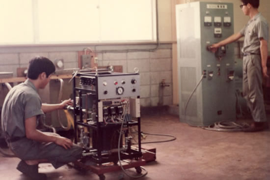 こうした開発における姿勢は、1960年代に築かれて継承されてきました。先駆けとなったのが、当社の千輝淳二(ちぎら じゅんじ・工学博士)を中心とする研究チームによる工作機械の熱変位に関する研究でした。その成果は液温自動調整機「OIL MATIC」の開発に結びつき、他にない一歩先をいく製品開発の始まりとなりました。以来、精密温調機の分野では、当社が新技術を搭載した製品を発表し、それがスタンダードになるというケースが繰り返されてきました。冷却液に「水」を使う「PURE MATIC」、極低温領域の「ICE MATIC」の開発や、ノンフロン冷媒を使う「ノンフロンOIL MATIC」の開発も、業界に先駆けての開発でした。
