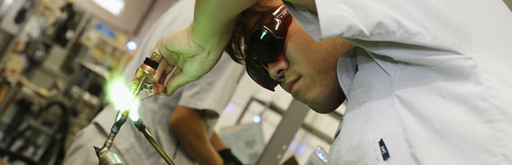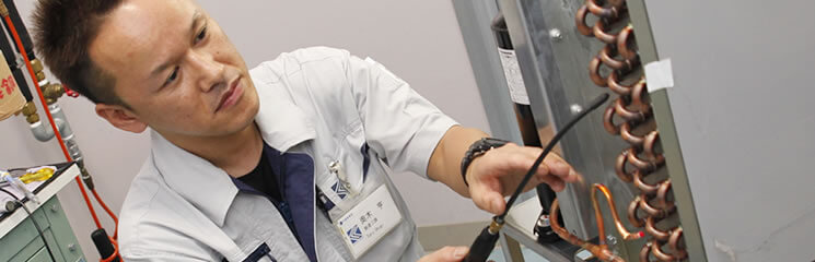 冷媒が循環する銅製パイプをロウ付けで主要部品間に取り付ける。作業には、ロウ付け技能者の資格と経験が必要になる。ロウ付けの仕上がり状態には厳格な基準が定められている。