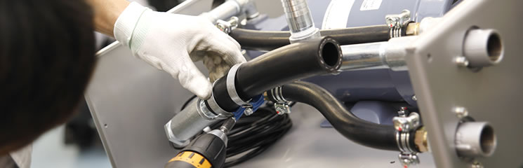 工作機械や各種産業機械といった冷却対象へ送出する冷却液(油・クーラント・水)の回路となる冷却器、ヒーター、クーラントポンプなどのユニットを取り付け、それらの間に配管をつなぐ「液配」と呼ぶ作業。