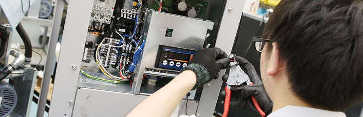 最終工程として製品の外装カバーを取り付け、冷却液の配管の吐出口、帰液口にそれを示すシールを貼る。その後全ての製品に対して計測器を使って性能試験を実施する。