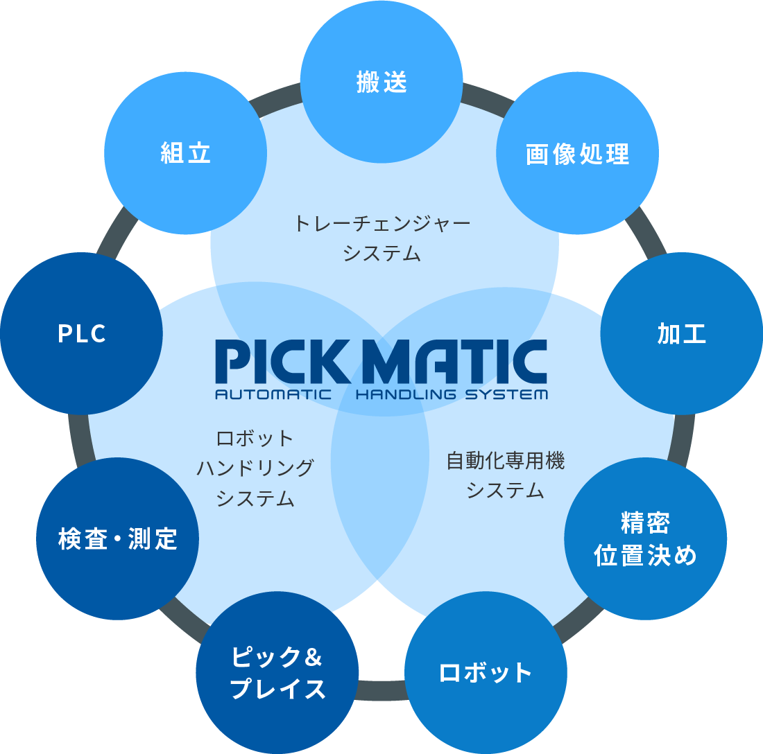 NC工作機械・組立ラインなどにおいて、メカトロニクス機器を導入した生産システムを構築する場合、搬送の自動化・高能率化が重要な要素となります。ピックマチックは、市販のトレーを媒体とし、搬送の標準化を指向したFAシステムモジュール「トレーチェンジャー」を中心とするシステムで、安価な「ピックアンドプレイス」やNC制御の複合ハンドリングシステム、またロボットを組み合わせたシステムの構築にいたるまで、蓄積されたノウハウを元に、お客様の幅広いニーズに応え、FAの実現に寄与します。