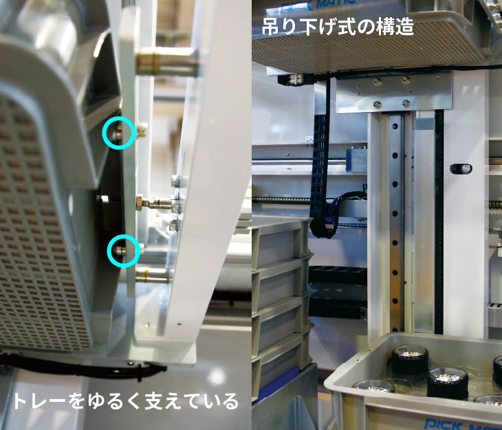 トレーチェンジャーは、トレーをゆるく支えて持ち上げて移動します。また、その可動部のバーも吊り下げ式の構造になっています。これは、万一トレーが移動中に何かにぶつかった場合でも、受けた衝撃を緩衝して中の部品等を傷つけないための設計です。ピックマチックは、どのような自動化も、まず部品を大切に扱い絶対に傷つけないことを前提にして開発されています。