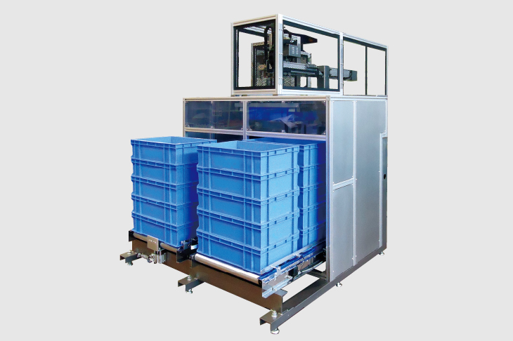 トレーチェンジャーは、高価な加工設備、組立機を休止のロスなく活用するために開発された、部品トレーの搬送システムです。部品、製品の入ったトレーやパレットを段積み、整列ストックし、設備への部品供給や加工製品の収納が可能です。トレーの収納方式や移動フローによる10種以上の標準タイプがそろっており、最適なシステム化を実現します。