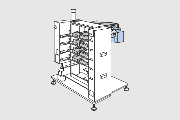 トレーチェンジャーは市販のトレーを使用しますが、お客様独自のトレーにも対応します。また、大容量ストックから多品種小ロット対応ストックまで、豊富なバリエーションを備え、長時間無人運転、工程段取りの効率化、作業者の複数設備管理を可能にします。