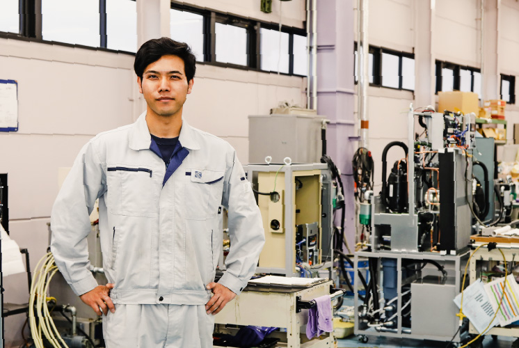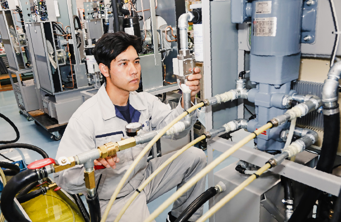 現在の性能検査を任されたことです。担当になった当初は、自分にできるか不安もありました。でも、先輩がしっかりレクチャーしてくれたこと、それまで液回路の配管や電装工程を経験できたことで、2カ月ほどで業務を覚えることができました。