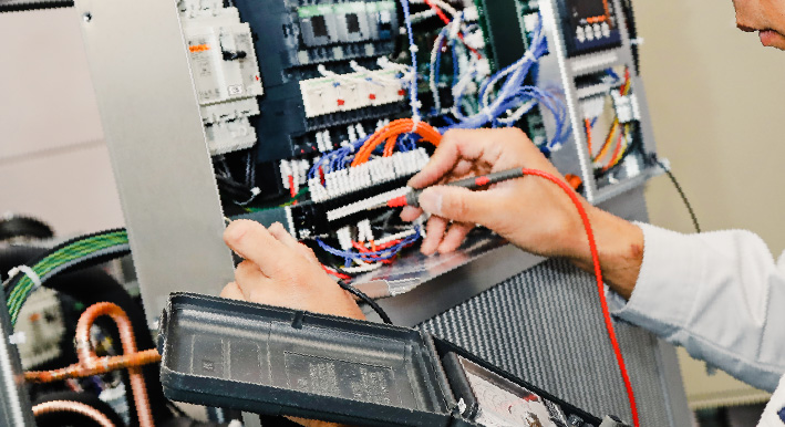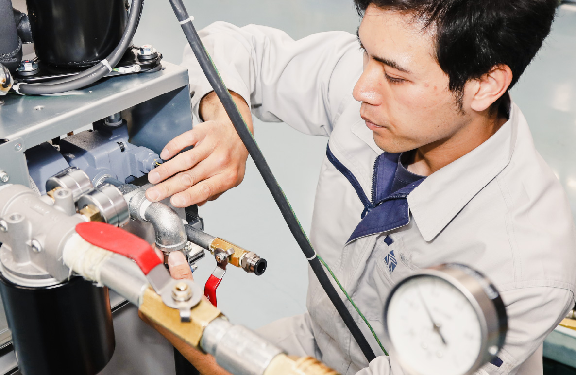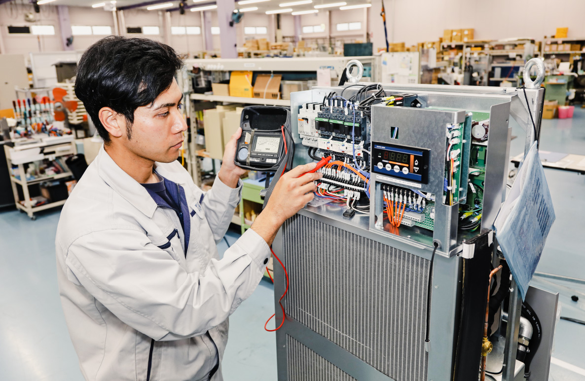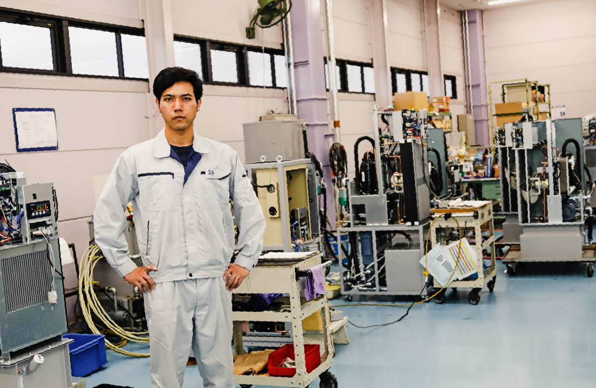 冷却液回路の配管作業やコントローラと各ユニットを信号線でつなぐ電気の配線作業等を経験し、現在は性能検査を担当しています。具体的には、目視や触って油漏れ等がないか確認。治具やテスターを使って仕様どおりの性能になっているかどうか、異常が発生した際、きちんとアラームが鳴るかどうかをチェックします。