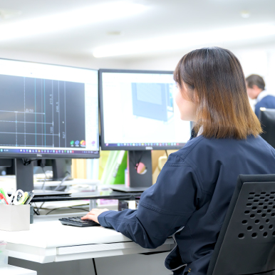女性でCADを担当していると聞くと、CADオペレーターを思い浮かべるかもしれません。でも、当社の場合は違います。専攻や性別に関わらず意欲があれば、機械設計の技術者としてお客様との打ち合わせから設計、組付け立ち合い、さらには評価まで一貫して携わることができます。実際、私も徐々に業務の幅を広げ、製品のレイアウトや部品の形状、構成まで自分で考えて創れるようになりました。オペレーターとは違った楽しさややりがいがあります。